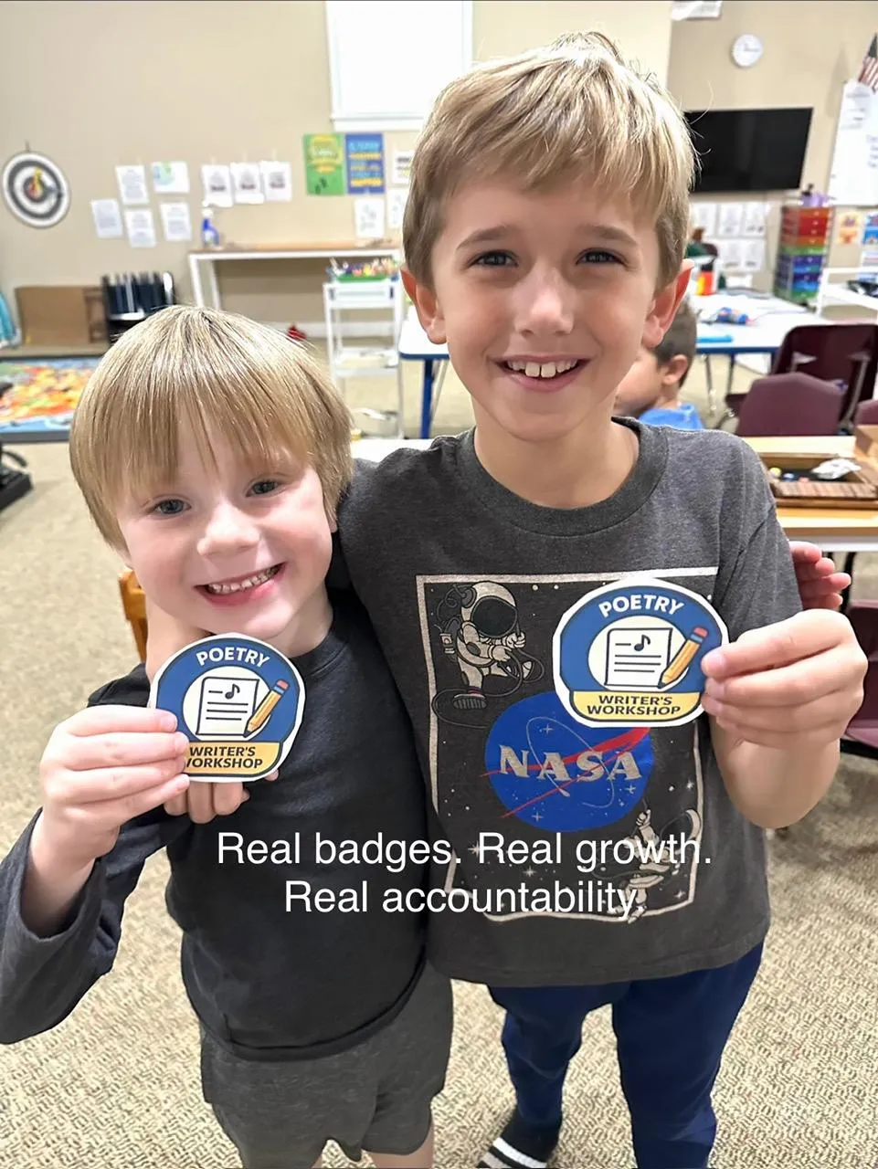 Parents use badges to track academic progress in Core Skills like reading, writing, math and spelling and character development in “Learn to Be” Badges.
